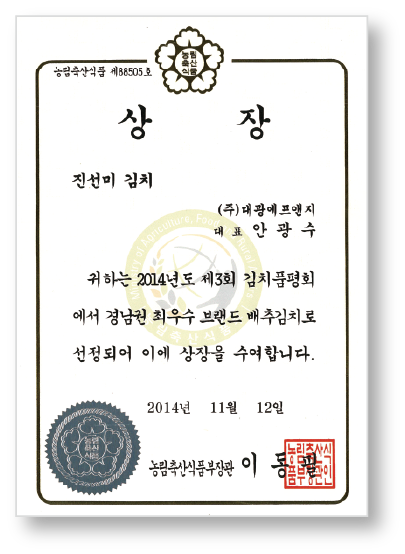 2013~14년 김치품평회 2년 연속으로 ‘진선미 김치’가